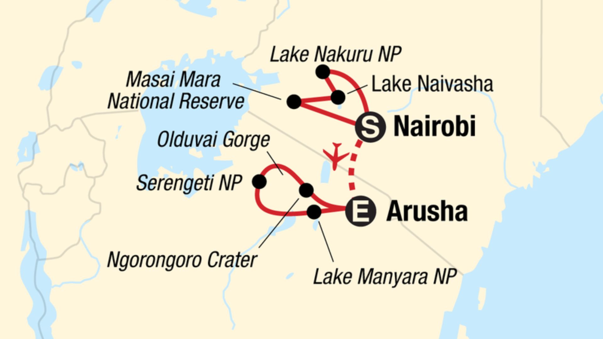 - Wildlife safari drives in Masai Mara National Reserve, Ngorongoro Conservation Area, Lake Nakuru, Lake Manyara, and the Serengeti